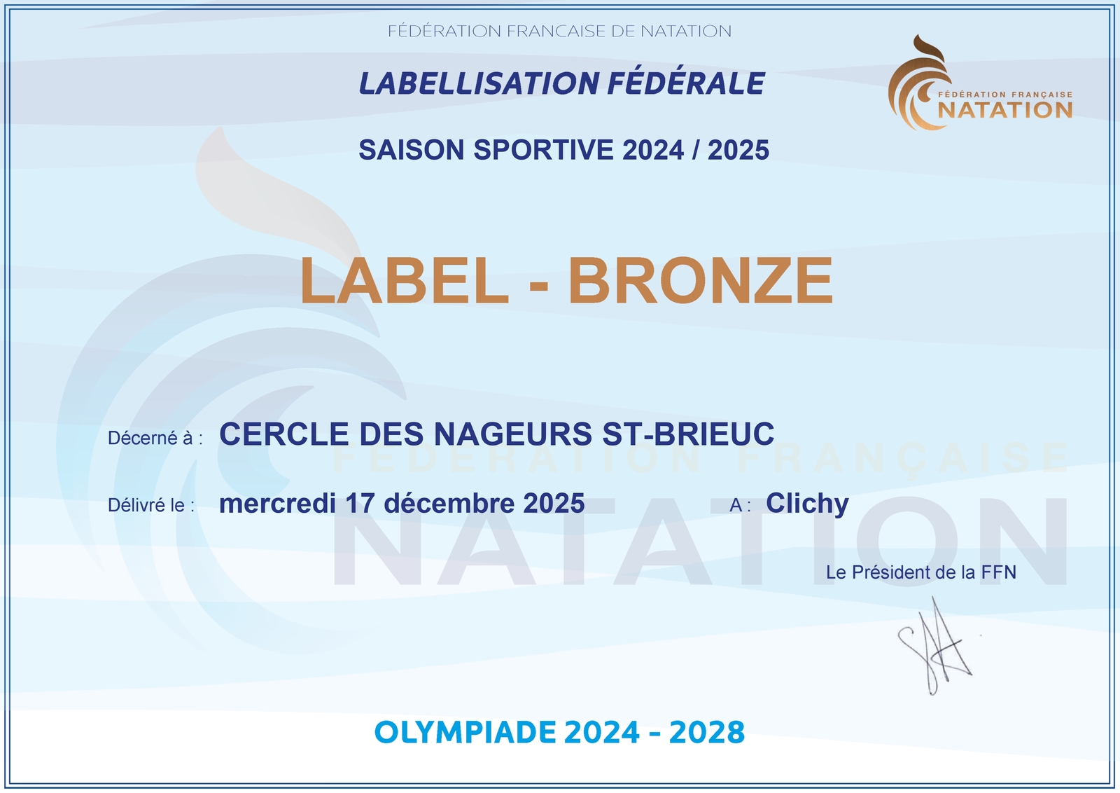 Le CNSB obtient à nouveau la labellisation Bronze, résultat du travail collectif des coachs, des bénévoles ainsi que de l’implication des nageurs et nageuses.